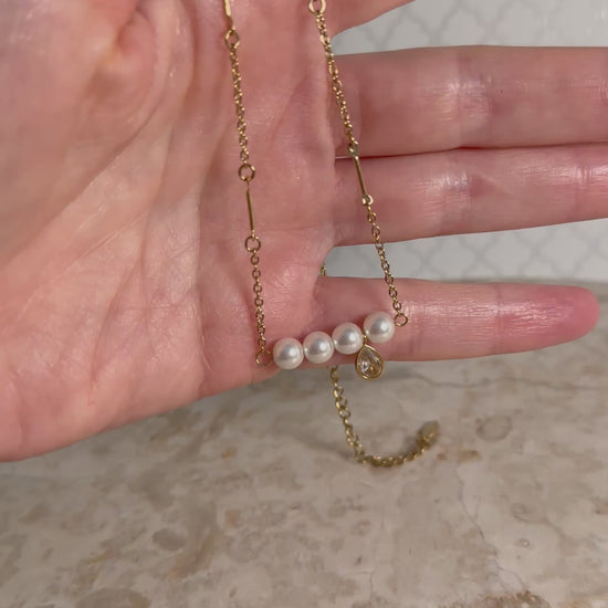 • Four radiant pearls set along a minimalist gold bar