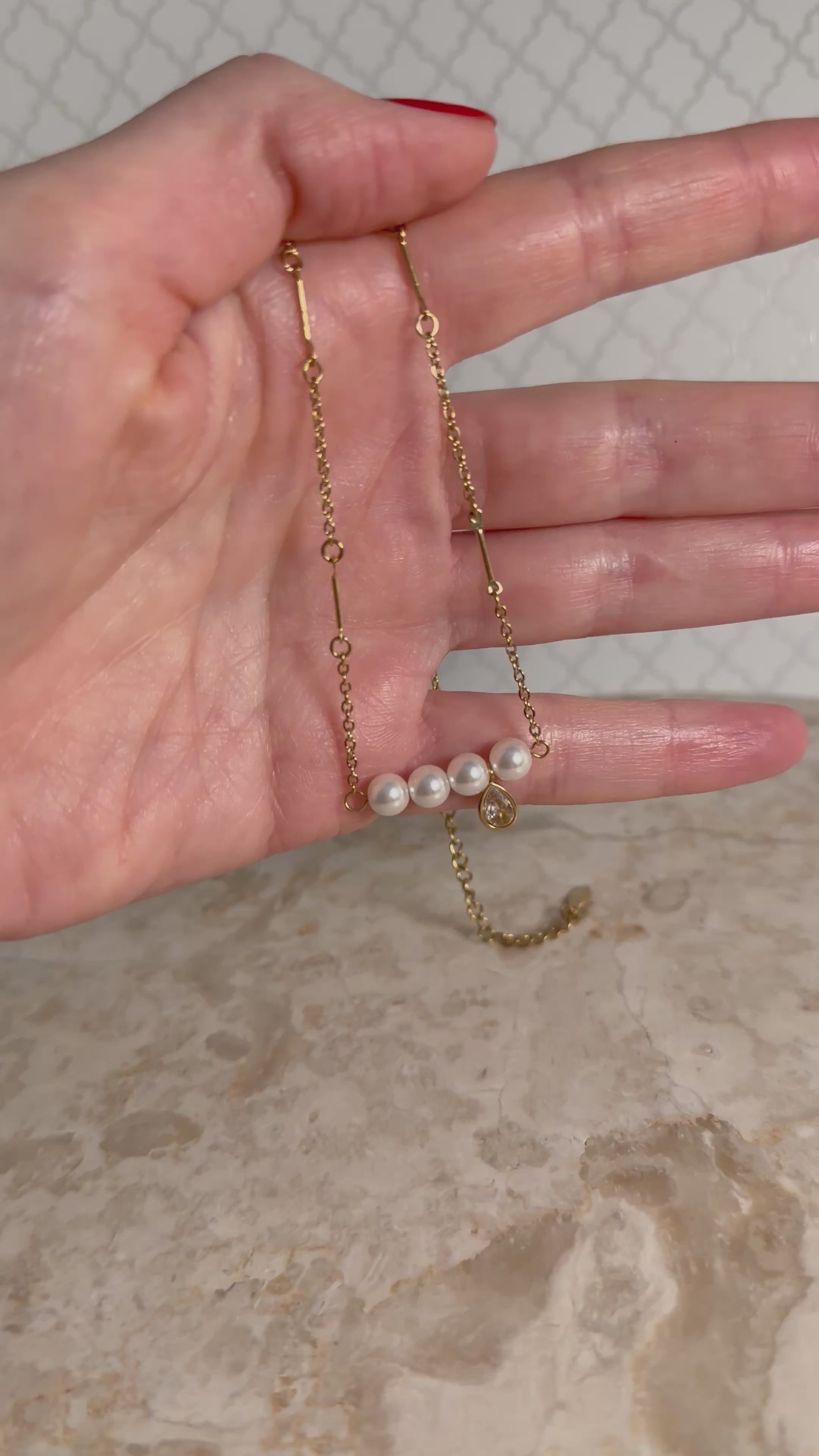 A delicate balance of sophistication and modern charm. This pearl bar necklace brings together four luminous pearls and a petite crystal drop, creating a soft, elegant sparkle that instantly elevates any neckline. The gold-plated chain features sleek bar links for an added touch of uniqueness—simple, refined, and beautifully feminine.