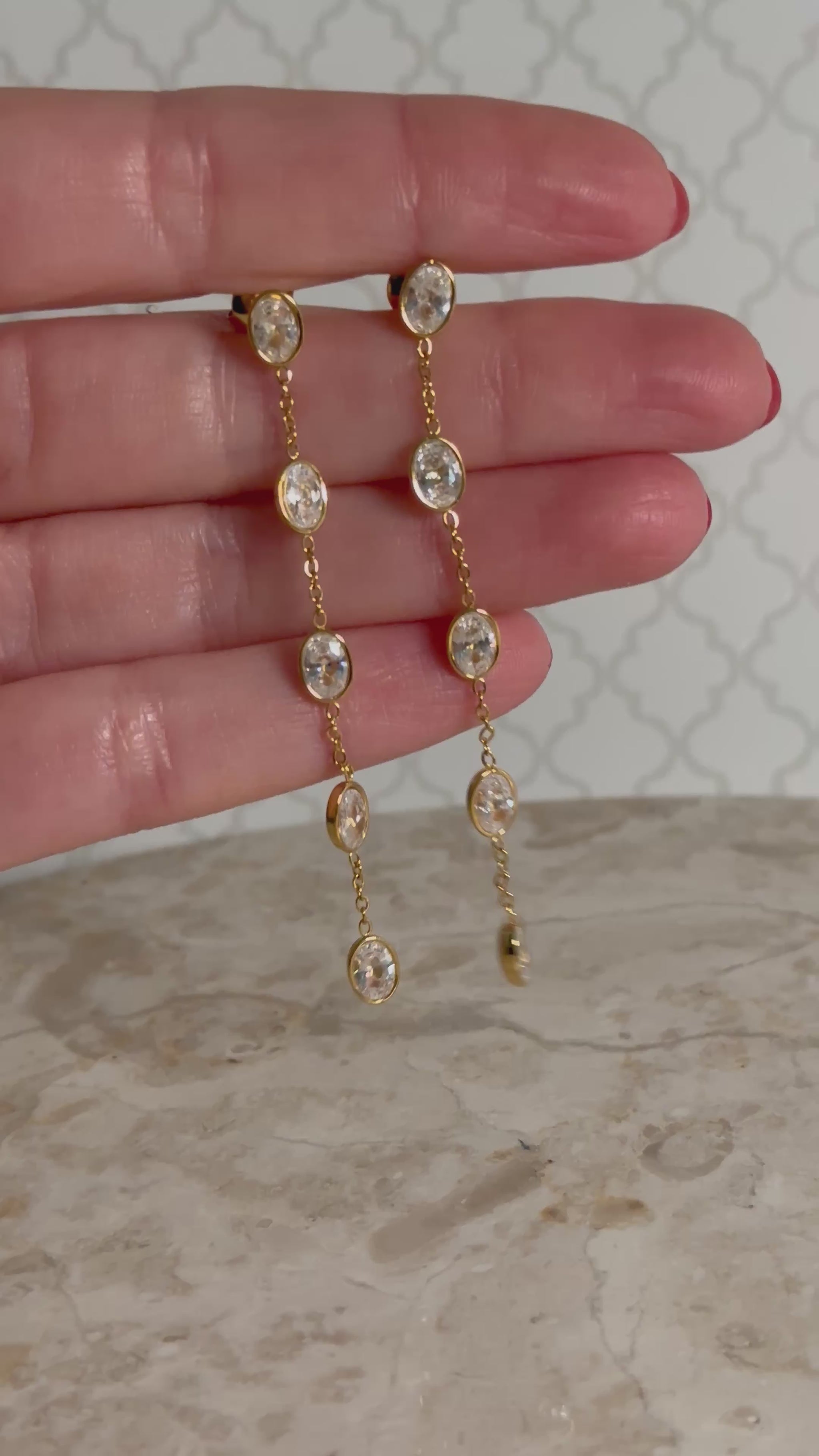 Each crystal is framed in warm 14k gold-plated stainless steel for durability, shine, and a luxe finish you can enjoy daily. Lightweight and comfortable, these earrings add the perfect touch of sophistication to date nights, special occasions, or chic everyday wear.