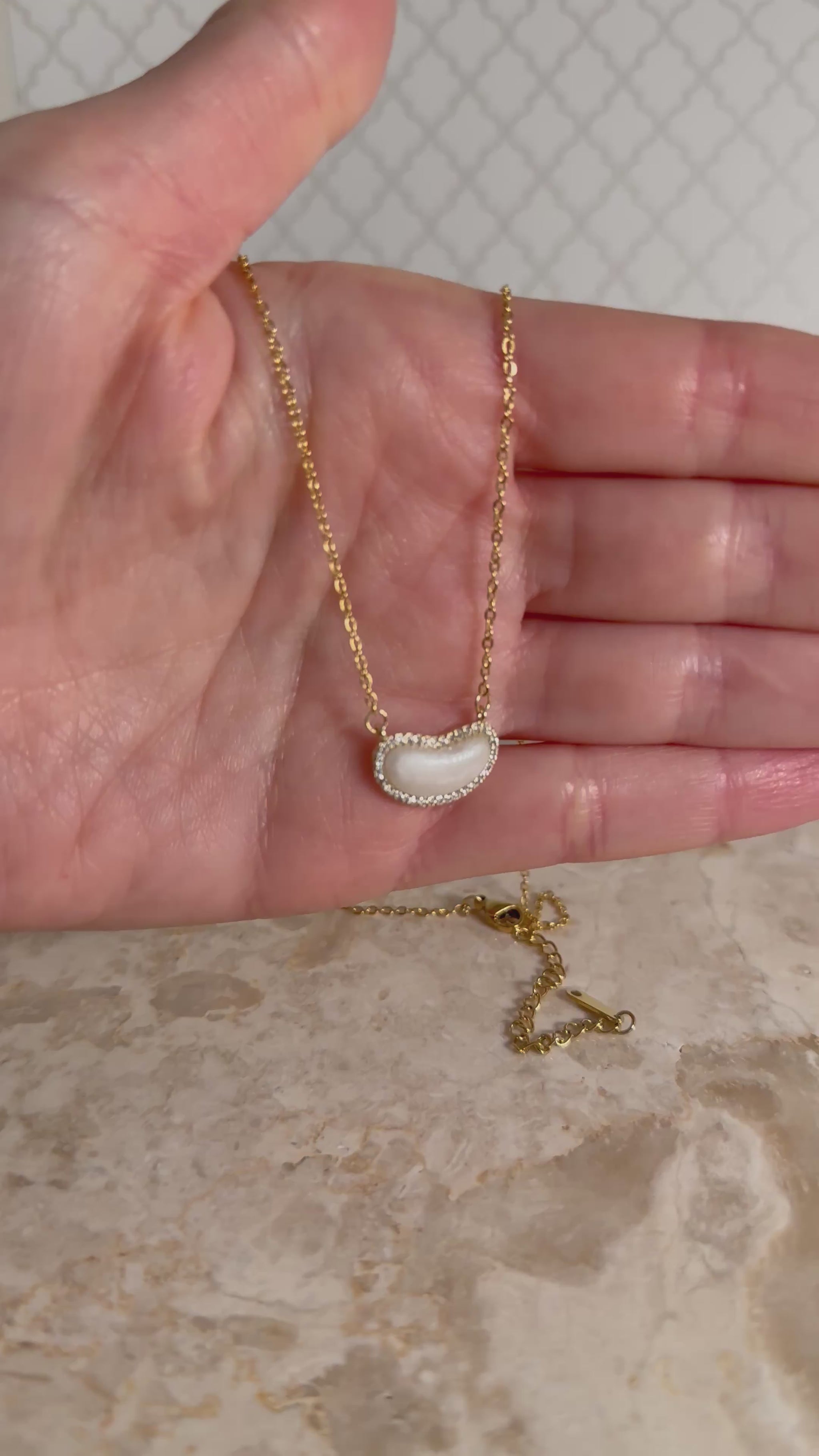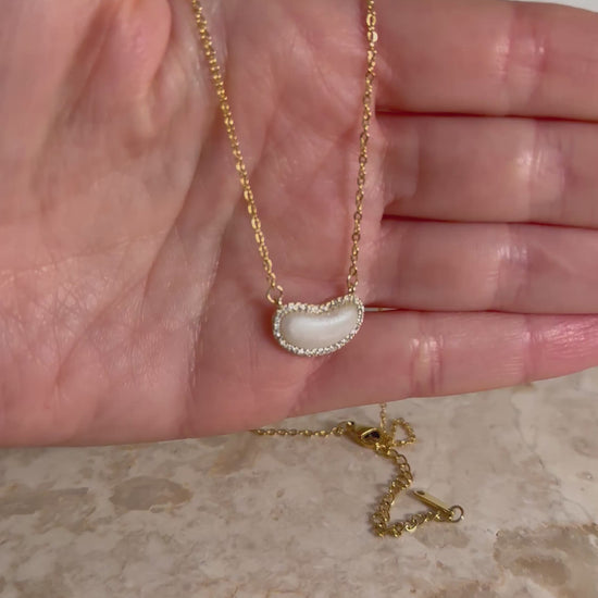 A soft touch of glow meets modern elegance in this stunning mother-of-pearl crescent necklace. The organic, curved silhouette catches the light beautifully, while the crystal-lined border adds a whisper of sparkle—never overpowering, always refined.