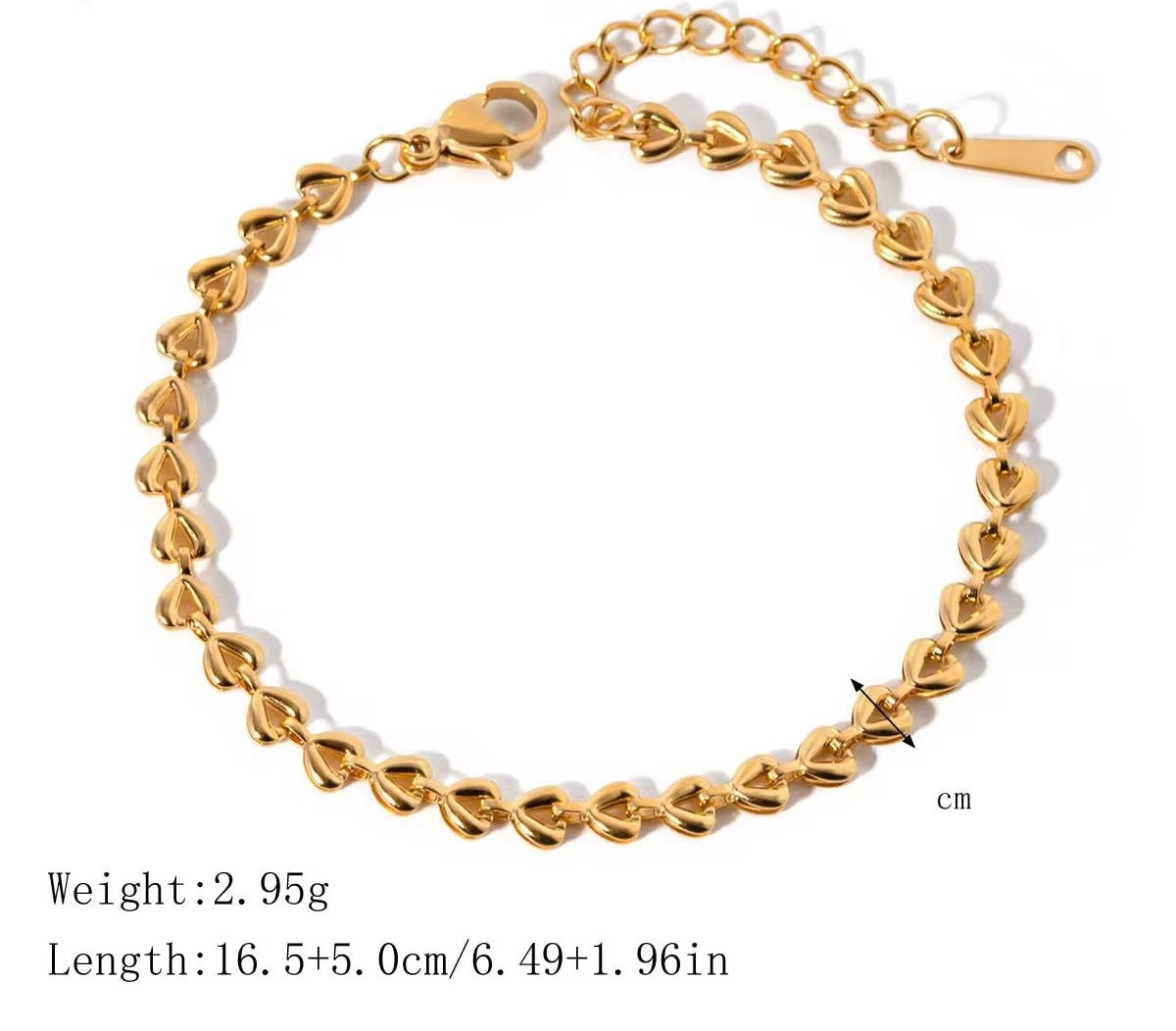 Designed to feel personal, feminine, and effortless, this heart chain bracelet is made for everyday wear. Each polished heart link is crafted from high-quality stainless steel and finished with 18K gold plating for long-lasting shine.